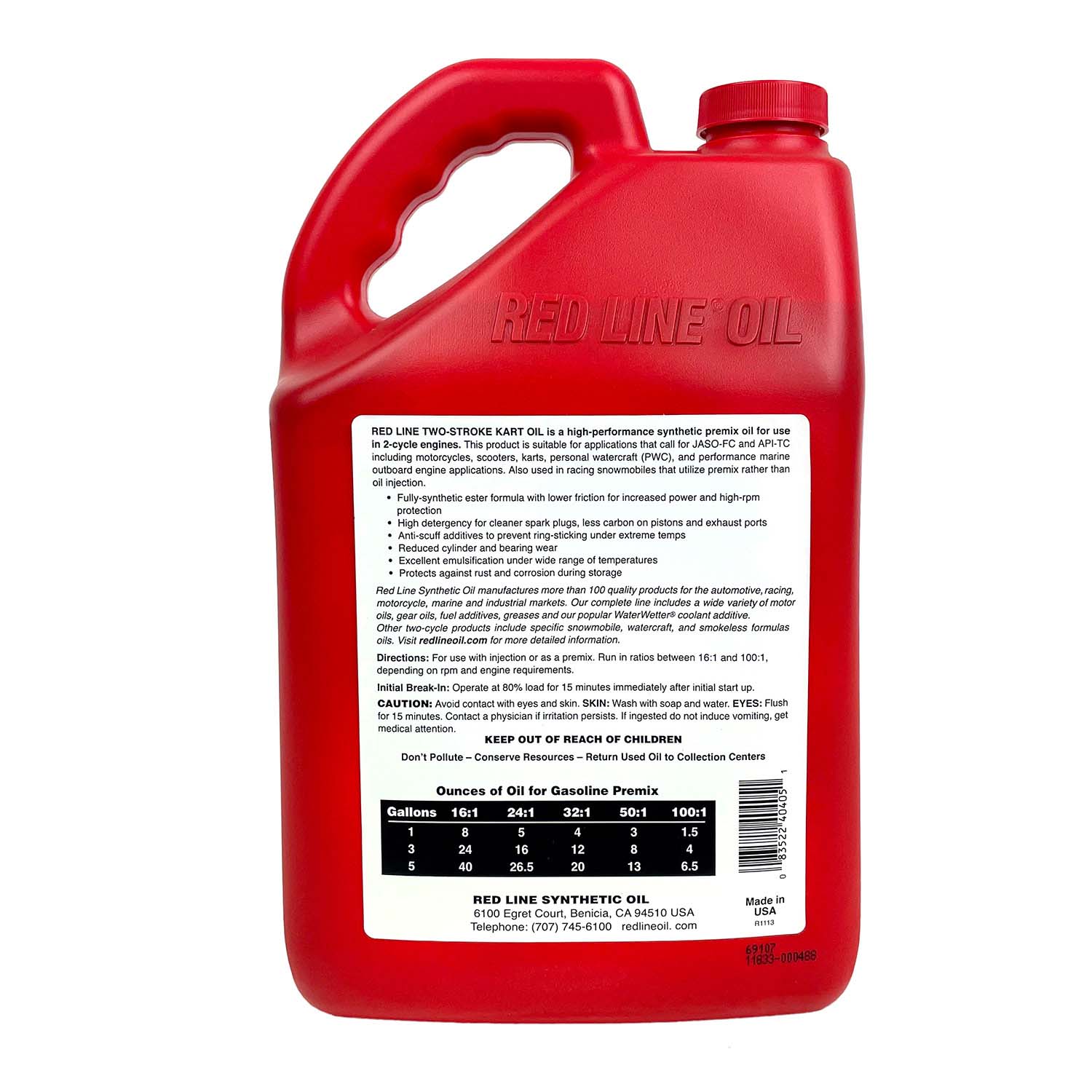 Two-Stroke Kart Oil är en fullsyntetisk esterbaserad super-premium olja. Utvecklad för bästa möjliga tvåtakts-prestanda. Esterbasens unika vidhäftningsförmåga och oljefilmstyrka ger ett smörj- och korrosionsskydd som är helt unikt. Lämnar i princip inga förbränningsrester. Något som förlänger livslängden på kolvar, cylindrar och lager. Den extrema renheten gör det möjligt för de rörliga avgasportarna att fungera felfritt under lång tid utan underhåll. Något som effektivt bidrar till motorns höga effektutveckling. Red Line Two-Stroke Kart / Racing Oil ger generellt 3-5% högre effekt till följd av effektivare smörjning och bättre tätning. Oljan rekommenderas till alla typer av högpresterande tvåtaktsmotorer såsom kartmotorer, motorcyklar, snöskotrar och marinmotorer. Oljan kan användas både som premix eller injektion.
