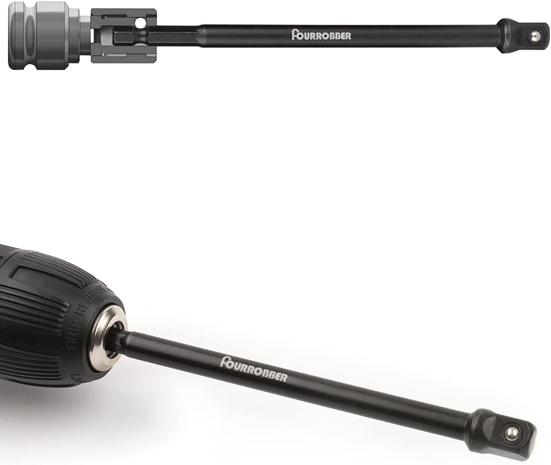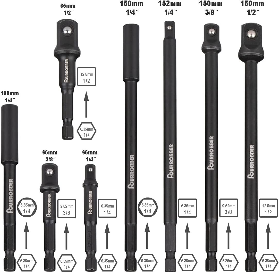 Adaptersats för hylsor med 1/2", 3/8" eller 1/4" fyrkantsfäste. Varje adapter har 1/4" sexkantsfäste för slagskruvdragare, borrmaskin eller handverktyg med bitsfäste och finns i två olika längder, den långa varianten är 150mm. Satsen innehåller även en lång och en extra lång bitshållare/förlängare med magnet.