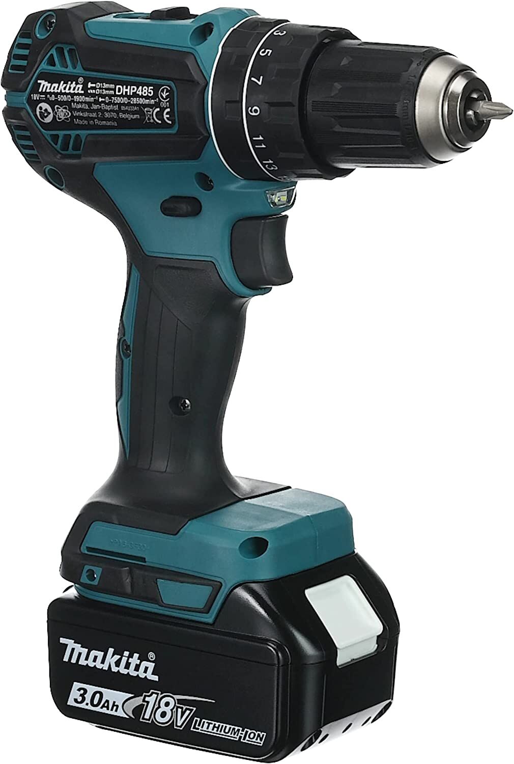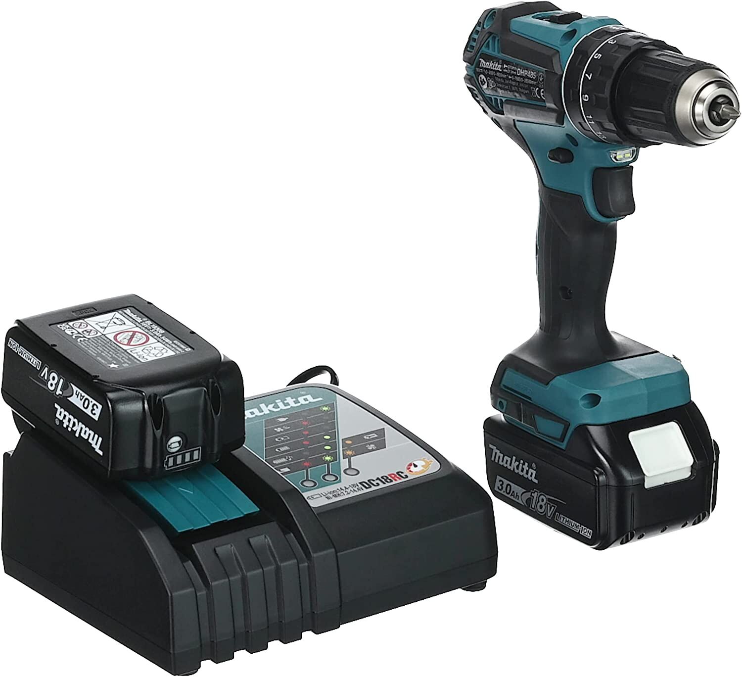 Slagborrmaskin Makita LXT 18V DHP485RFJ. Komplett paket med 2 st BL1830B 3.0Ah batterier, DC18RC laddare och MAKPAC2 förvaringslåda.