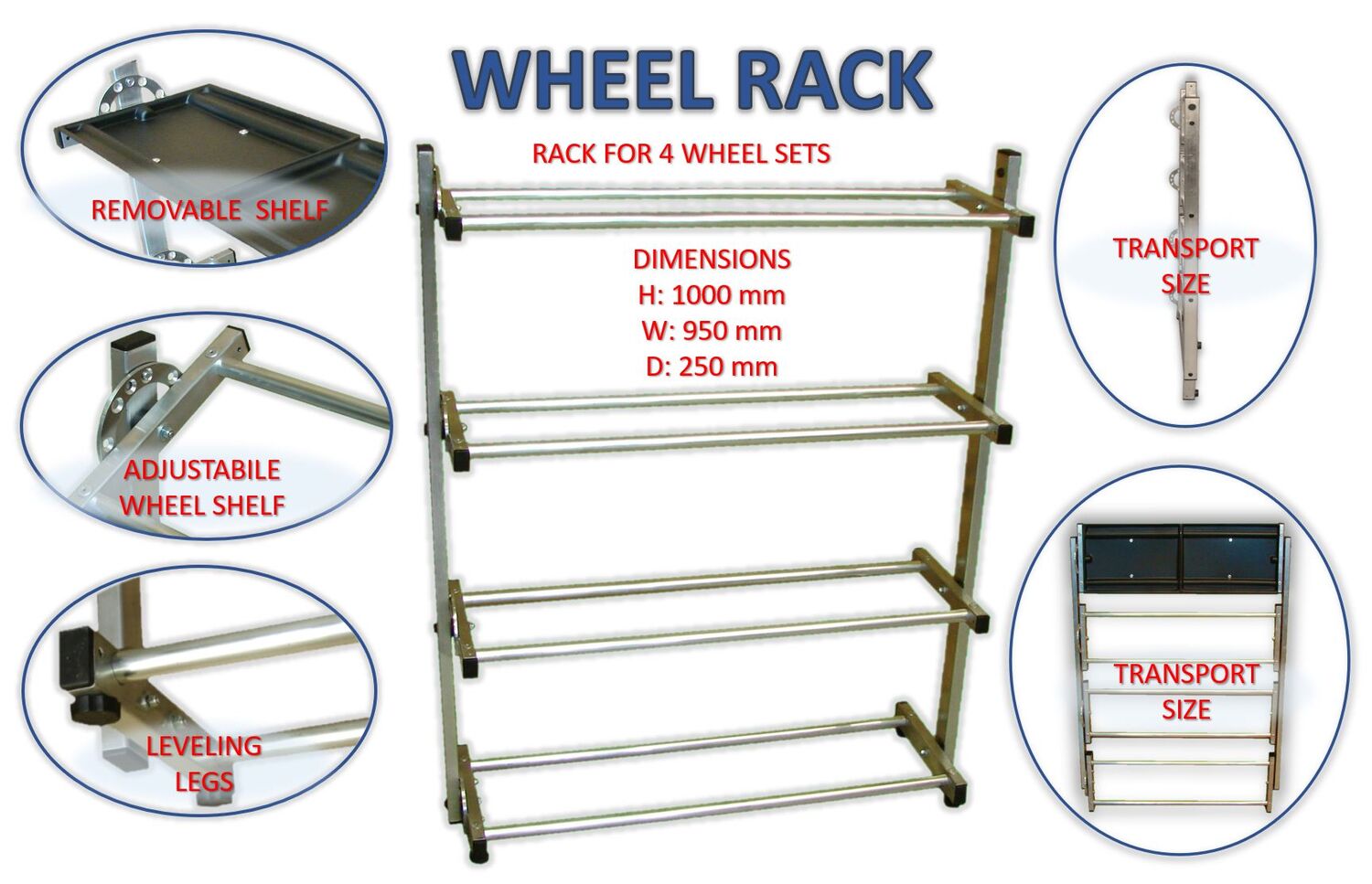 Tekniska data: SA-099 Stone Wheel Rack är tillverkad av aluminium, har justerbara hyllor som gör att du kan förvara alla dina däck (4 set) i ditt depåtält, släp eller verkstad. - Funktioner: Avtagbar hylla, justerbar höjd, mycket liten för transport, inga verktyg behövs för montering.
