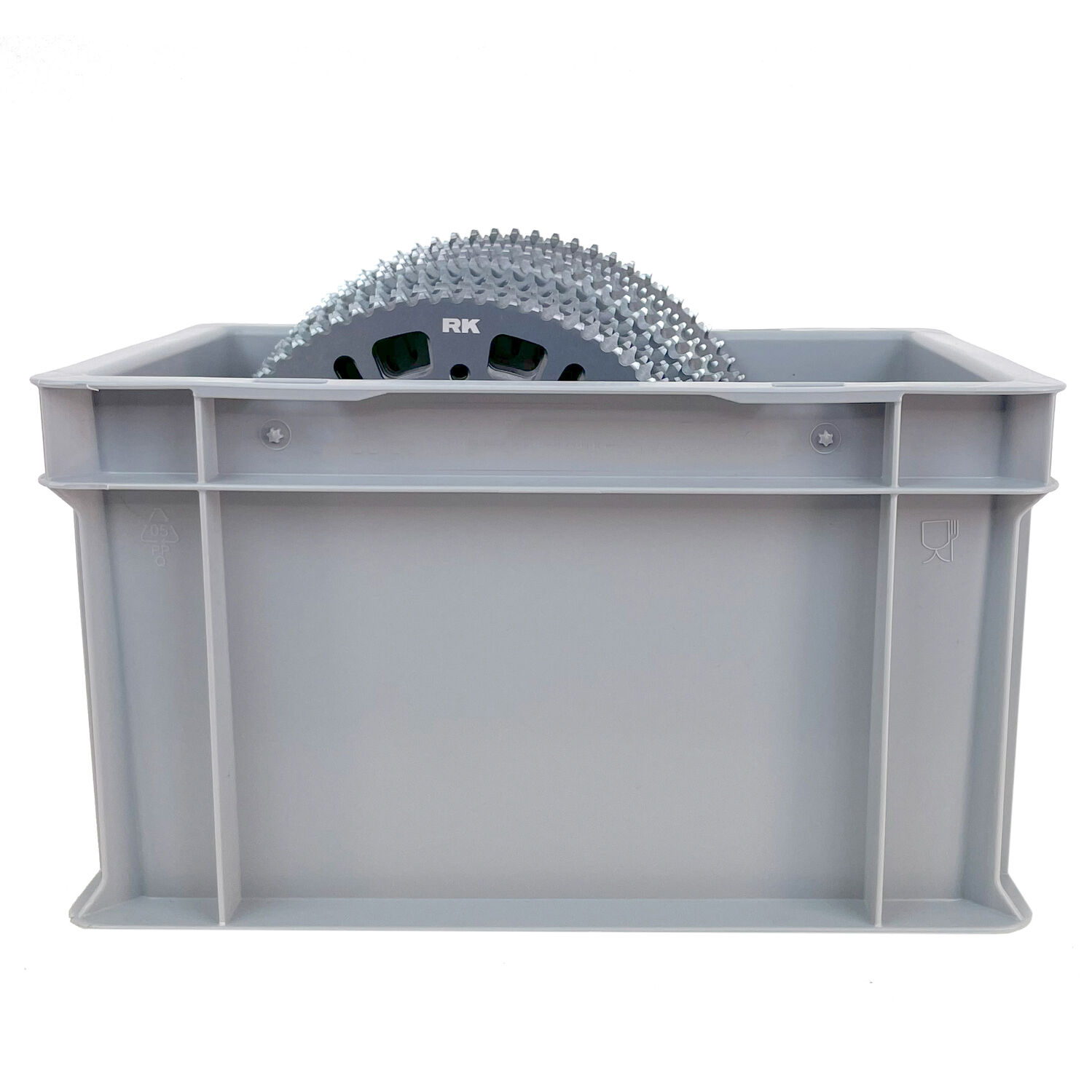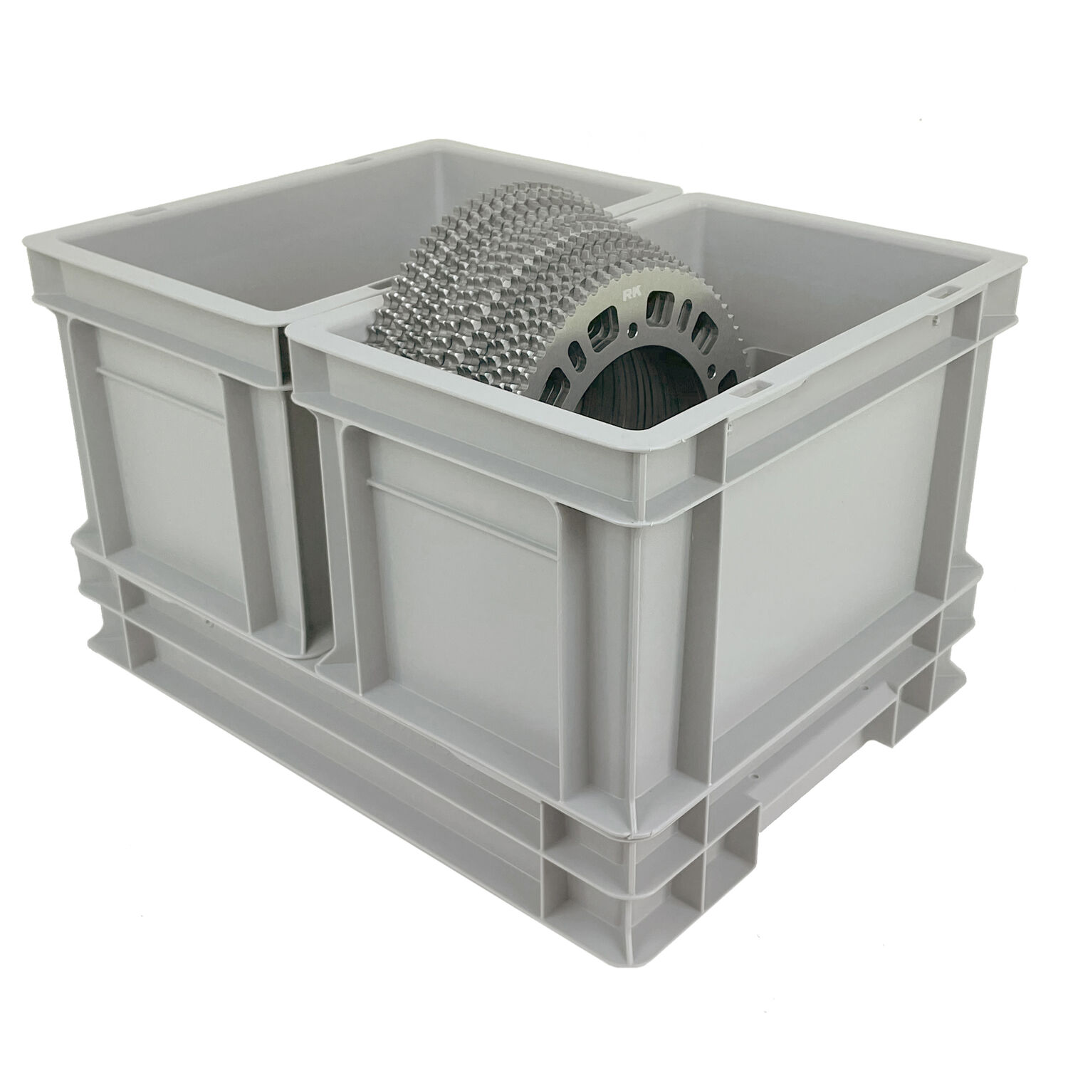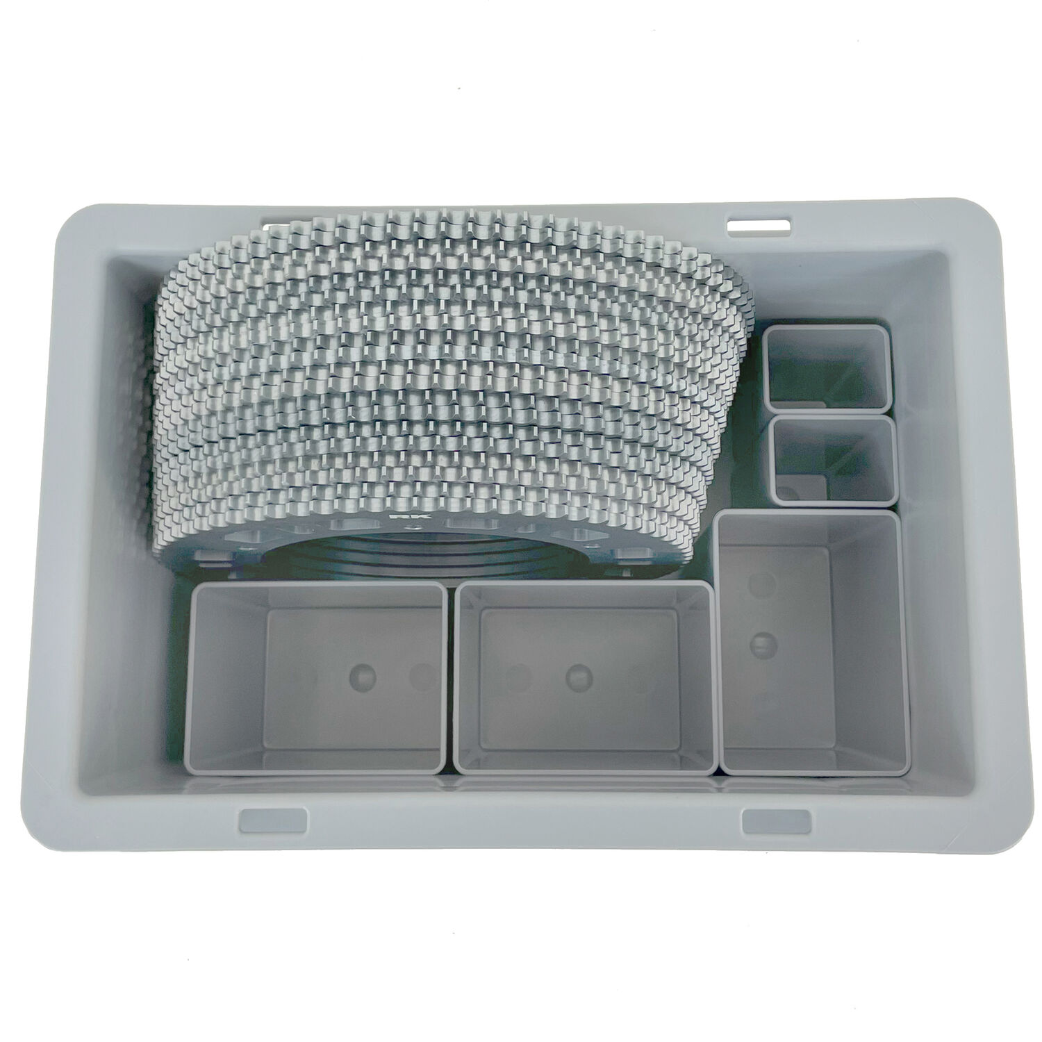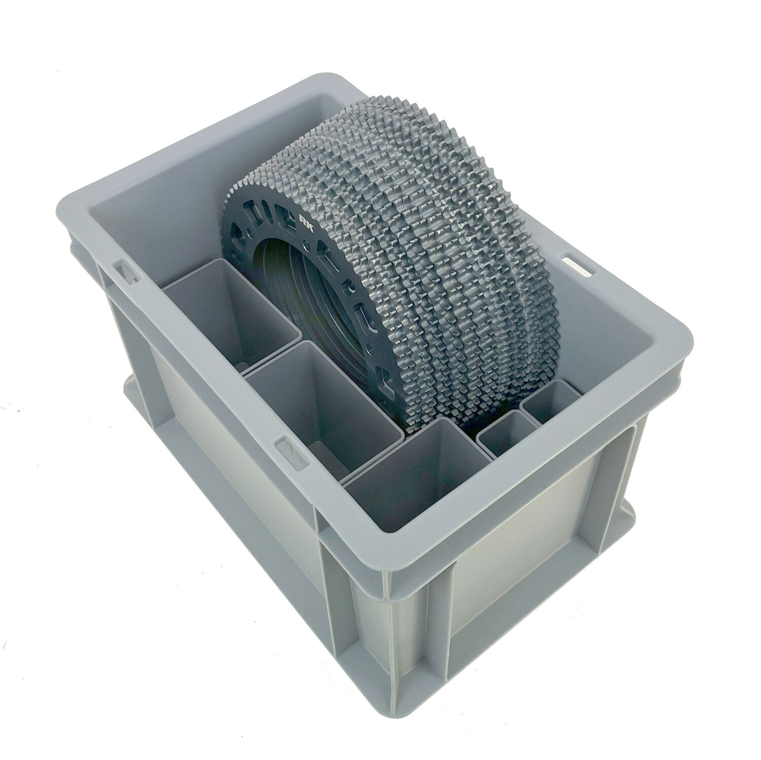 Plastback för transport och förvaring av drev, kedjor och verktyg.