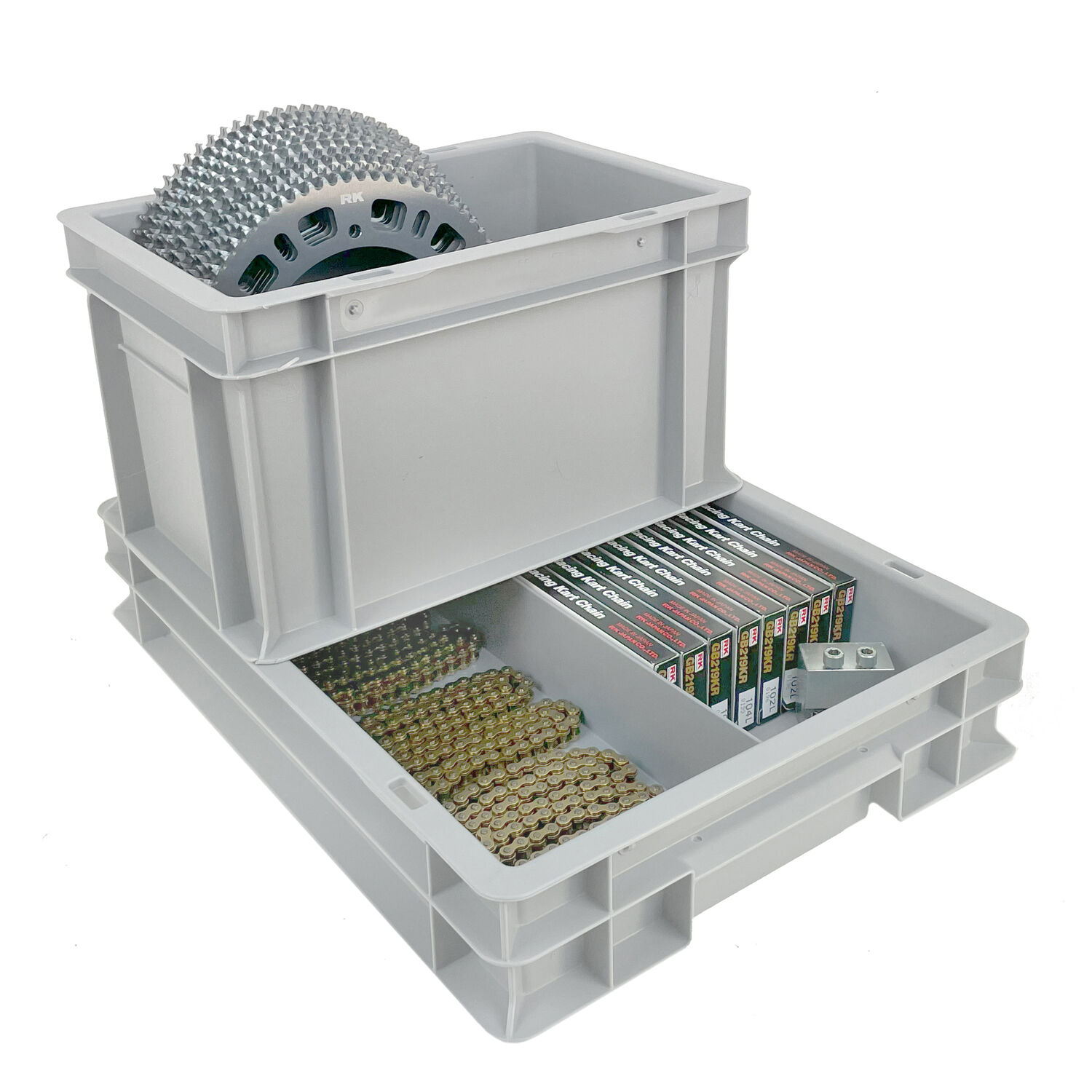 Euroback Premium Std 40x30x7,5 cm med slutna grepp på kortsidorna*. Det ingår ett långsmalt fack där du med fördel kan förvara din uppackade/använda kedjor. Nya kedjor med mera får prydligt plats vid sidan om facket. En modern, flexibel och prisvärd Euroback av högsta kvalitet!