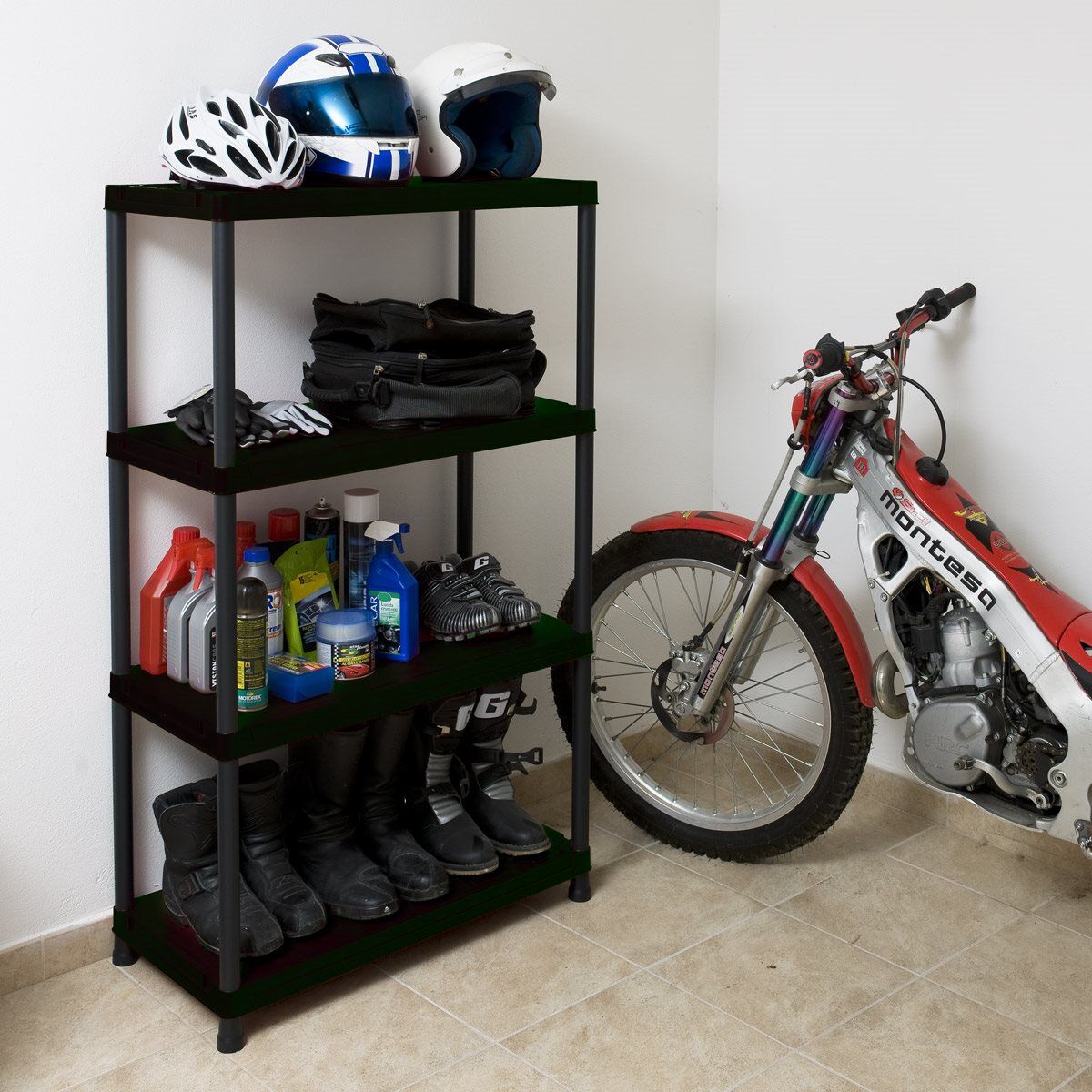 Den här praktiska hyllan är snabb och enkel att montera för att få extra förvaringsutrymme i depåtältet, verkstaden eller förrådet. Perfekt att ställa din motorlåda, drev, hjälm och annan utrustning. 4 hyllplan som klarar 50 kg belastning vardera. Varumärket Toomax håller överlägset bäst kvalitet på den här typen av plasthyllor. De är stabila och klarar betydlig tyngre belastning än många liknande.