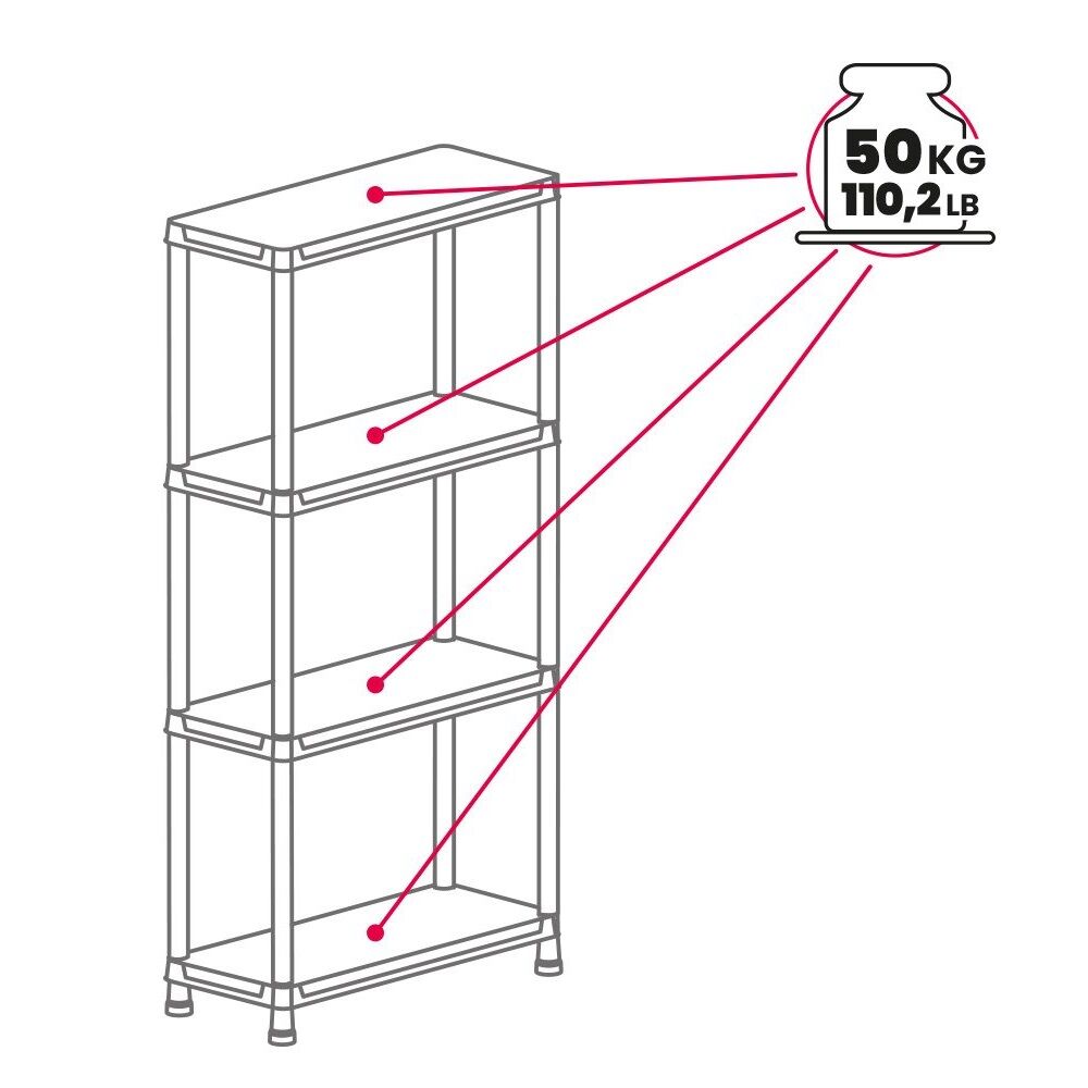 Den här praktiska hyllan är snabb och enkel att montera för att få extra förvaringsutrymme i depåtältet, verkstaden eller förrådet. Perfekt att ställa din motorlåda, drev, hjälm och annan utrustning. 4 hyllplan som klarar 50 kg belastning vardera. Varumärket Toomax håller överlägset bäst kvalitet på den här typen av plasthyllor. De är stabila och klarar betydlig tyngre belastning än många liknande.