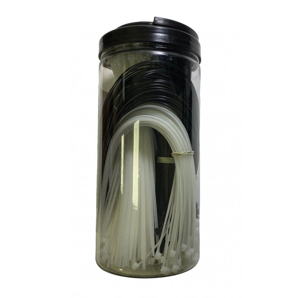 600 st svarta och vita buntband i tre olika storlekar. Levereras i plastburk med lock.